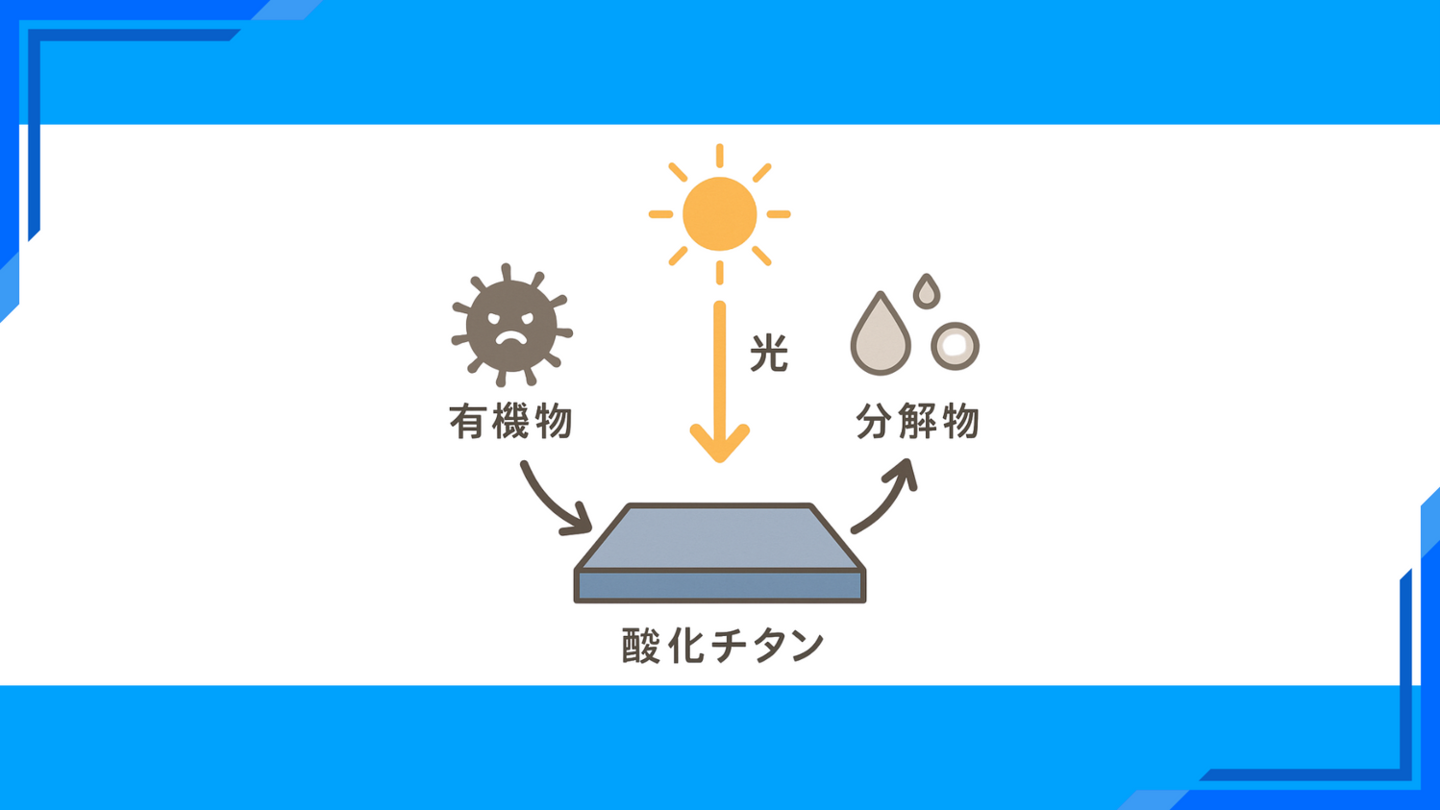 太陽光・蛍光灯・LEDなどの光がコーティングされた表面の酸化チタンに当たると、菌やウイルスを除菌、不活化し、ニオイの元などとともに、最終的には二酸化炭素と水に分解していきます。