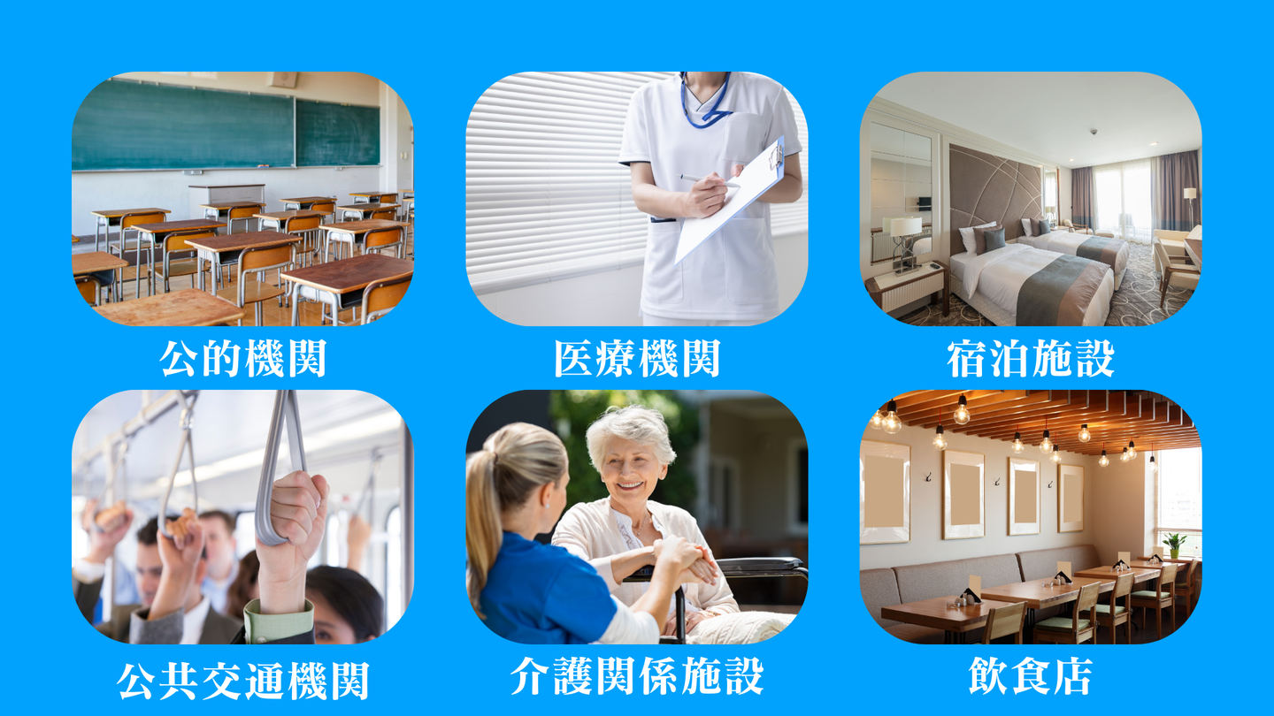 公的機関、公共交通機関、医療機関、介護関係施設、教育関係施設、宿泊施設、飲食店、レンタカー、カーシェアなど。オフィスやご家庭にも。